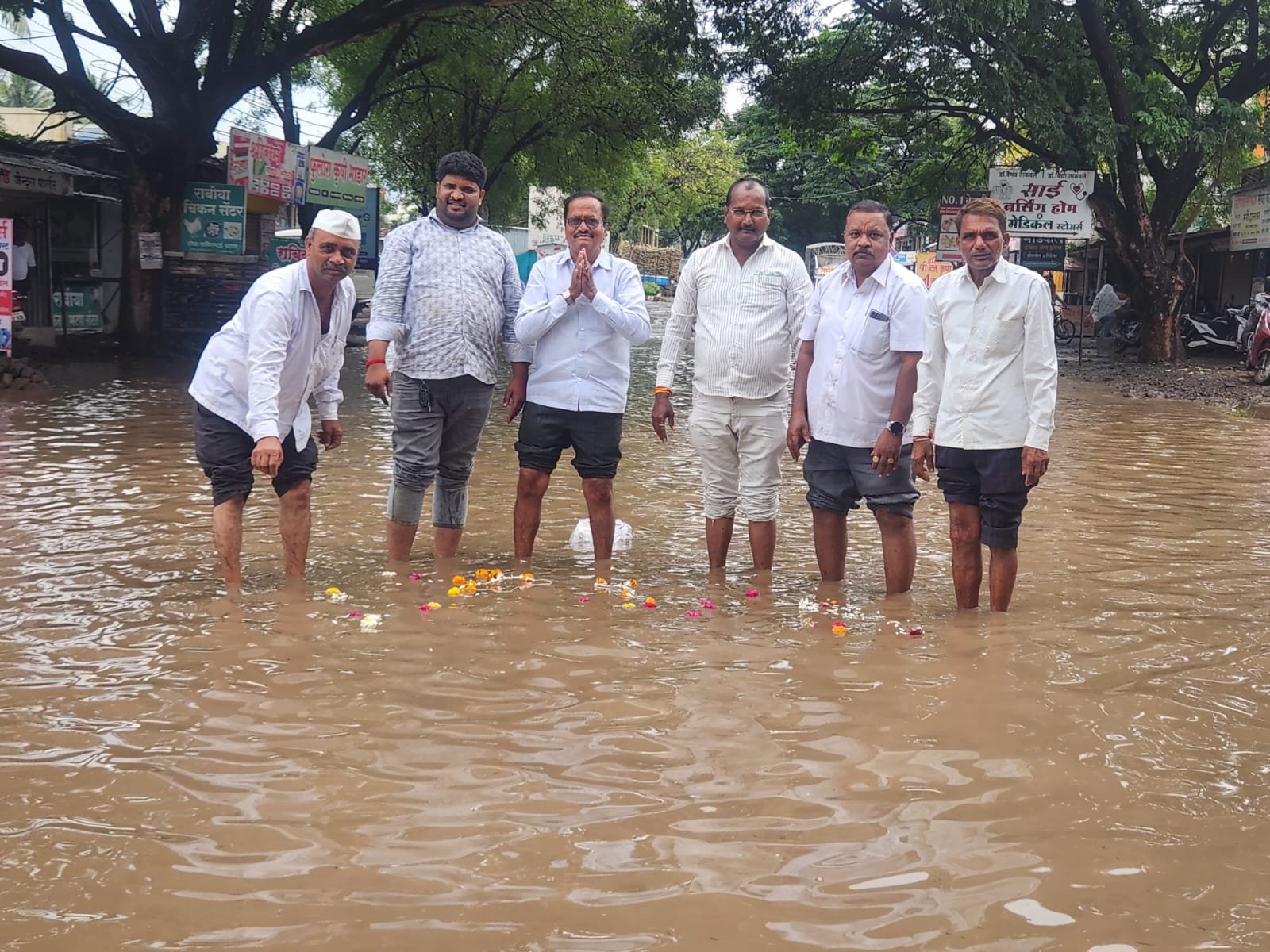 या रस्त्याच्या कडेला अनेक छोटे मोठे व्यवसाय असून त्यांचे मोठे नुकसान होत आहे.त्या मुळे ग्रामस्थांच्या वतीने” रस्त्यावर पुन्हा येऊ नको बाबा ” असे साकडे घालून या पाण्याचे जलपूजन करून स्थानिक व शासकीय प्रशासनाचा निषेध व्यक्त करण्यात आला.