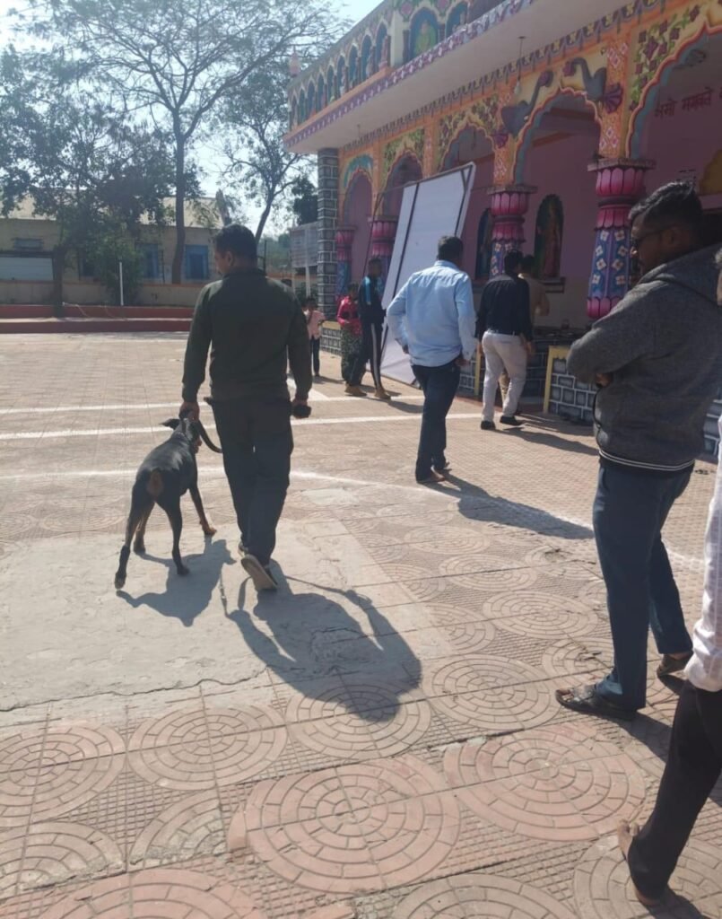 (मंदिर परिसरात श्वानपथकद्वारे शोध घेताना पुणे ग्रामीण पोलीस)